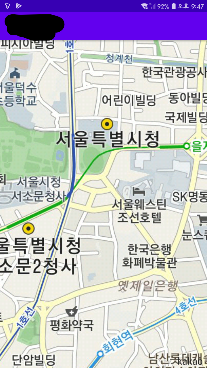 정상 실행된 동작화면 근데 나는 여러가지 시도를 해봤지만 PC 안드로이드 가상시뮬에서는 MAP API가 실행안되고 계속 실행이 중단되어서 폰으로 APK를 받아 설치하여 실행해보니 정상작동하였다.