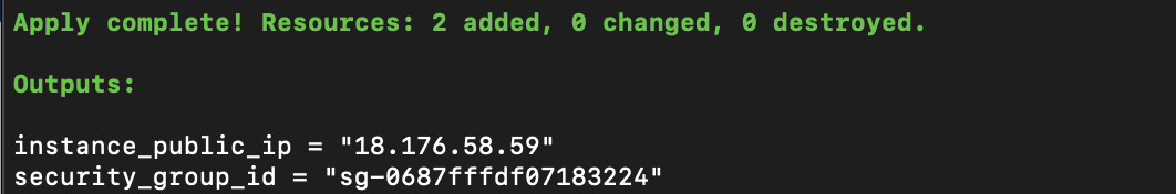 #output.tf #ec2 public up 출력 output "instance_public_ip" { value = aws_instance.public_ec2_test.public_ip } #public sg 그룹 id를 출력 output "security_group_id" { value = aws_security_group.public_test_sg.id }성공시 다음과 같이 출력 된다.
