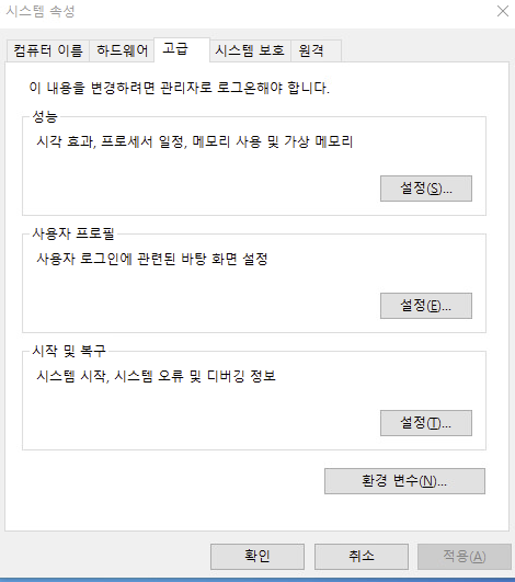 시스템 속성 (윈도우 검색에 치면 나옴)