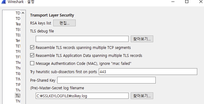와이어 샤크 실행 후 편집 - 설정을 실행한 후 Protocols에서 TLS를 찾아 아래의 사진 처럼 입력한다.
