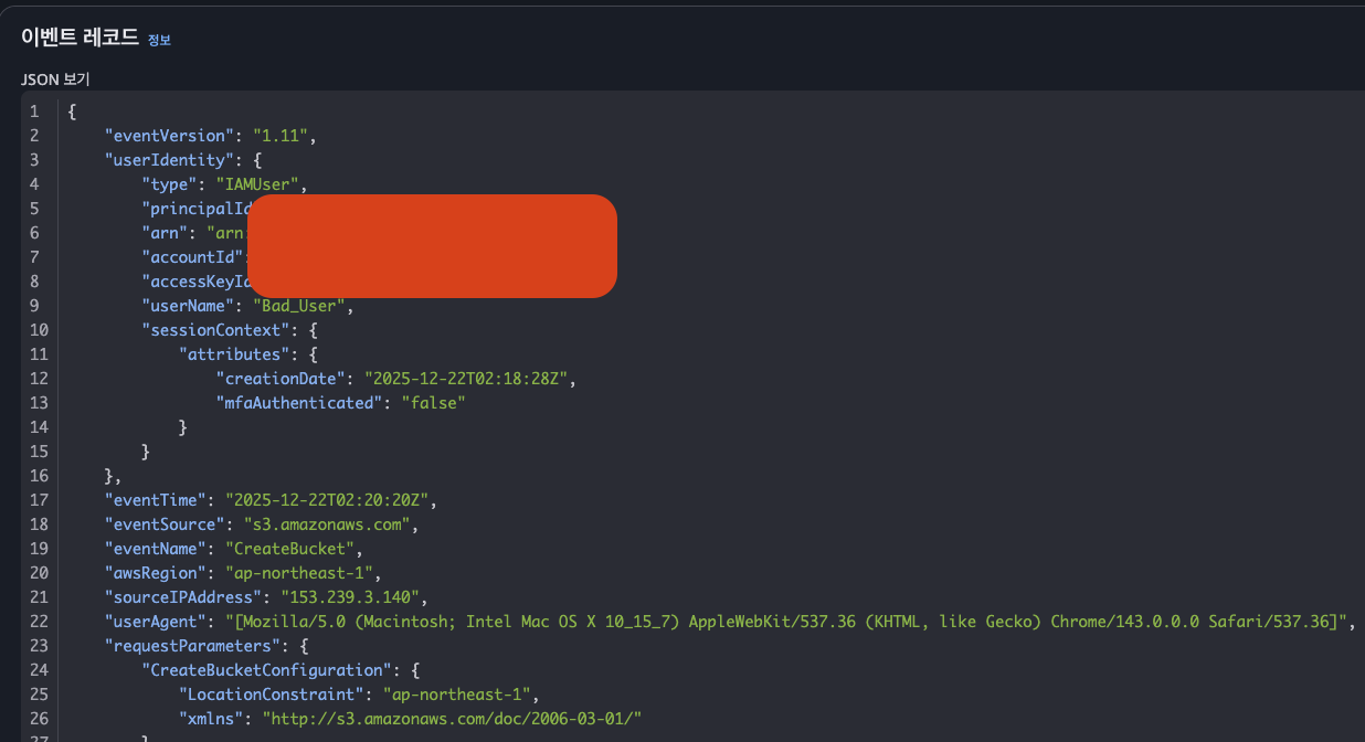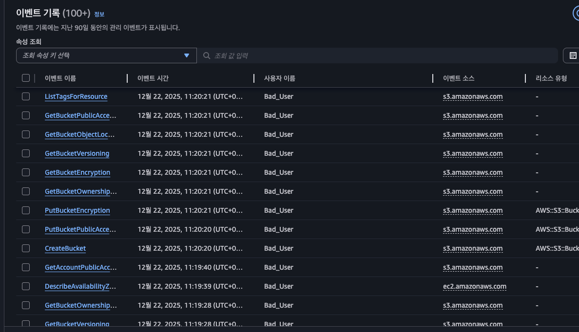 이벤트 기록 항목에 들어가면 다음과 같이 특정 IAM 유저가 활동한게 전부 기록되어있다.