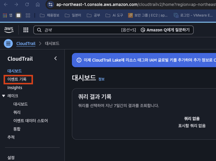 로그를 보고 싶다면 대시보드 아래있는 이벤트 기록을 클릭한다.