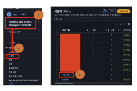 우선 계정은 사전에 만들었다 가정하고 IAM - 사용자 - 사용할 계정을 클릭한다.