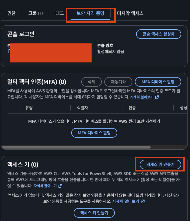 그리고 사용자 설정 콘솔에서 보안 자격 증명 - 액세스 키 만들기를 클릭한다.