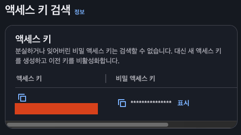 키를 발급받으면 비밀키랑 액세스키가 생성된다.