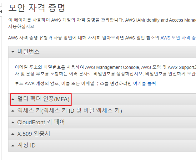 로그인 후 상단에 계정을 클릭 한 후 보안자격증명을 클릭한 뒤 MFA 설정을 한다.