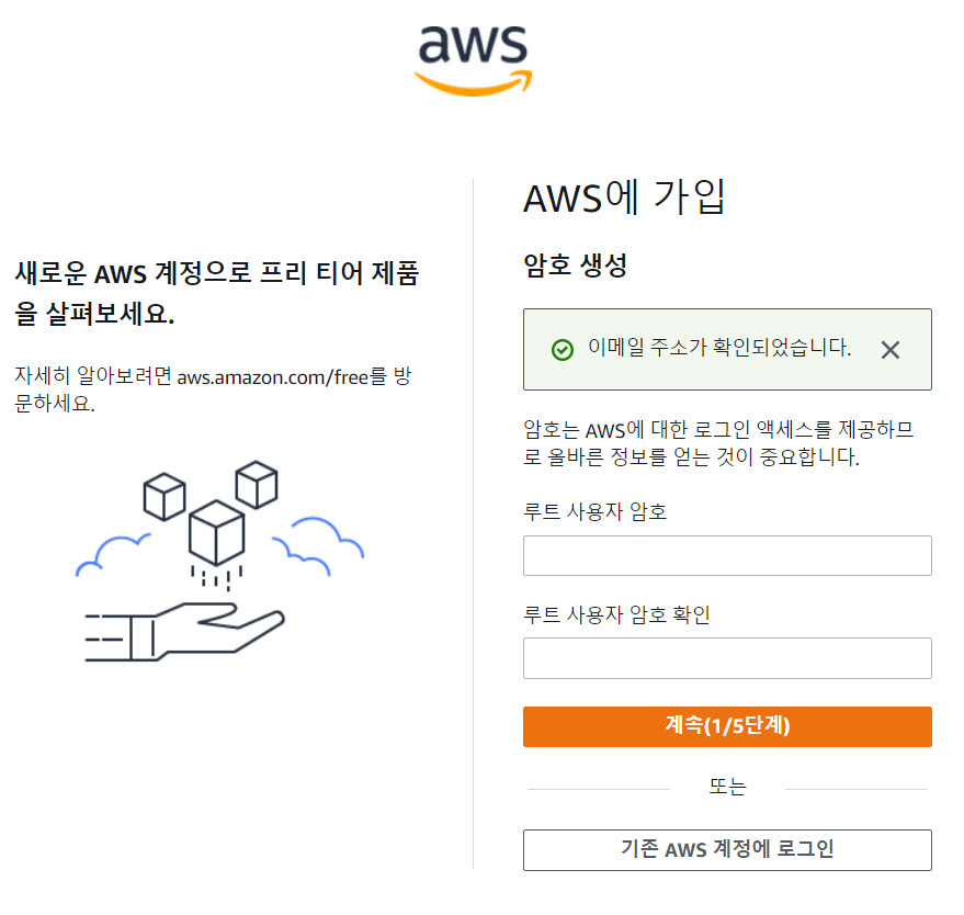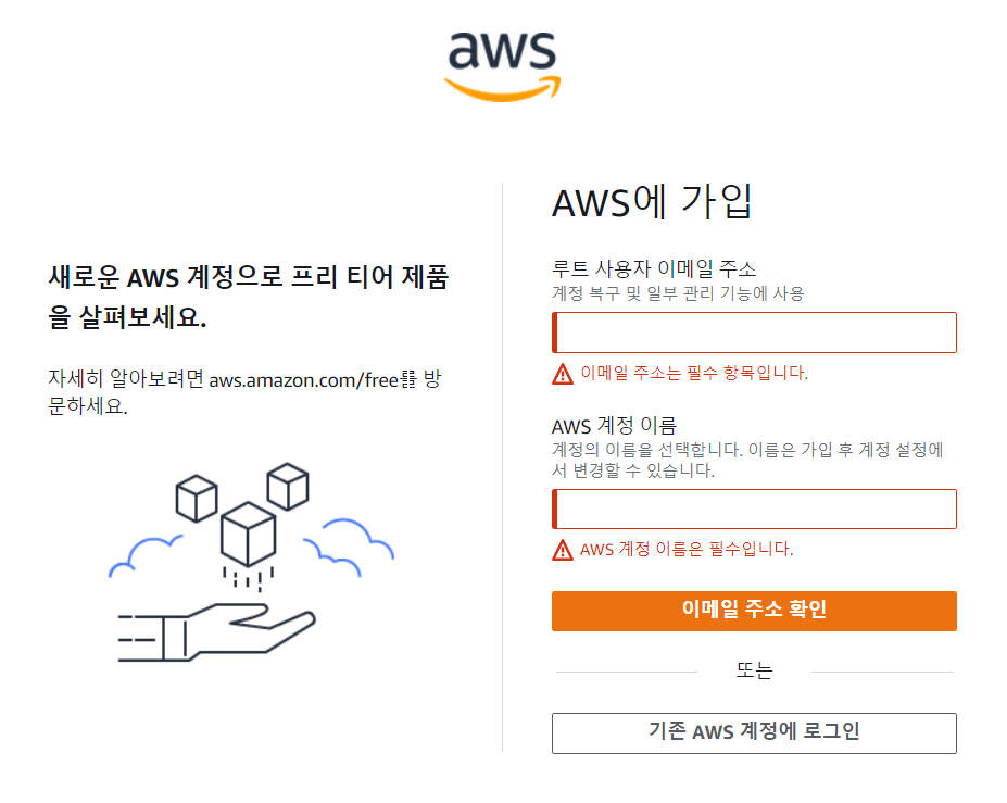 가입 페이지 가입 버튼을 누르면 루트 사용자 이메일 주소 입력과 계정이름을 입력하라고 나온다.